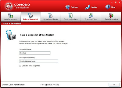 Um bom observador pode desprezar a eficiência de Comodo Time Machine, uma vez que o próprio Windows já conta com um recurso chamado “Ponto de Restauração”. A ferramenta do Windows pode sim desfazer uma série de mudanças na máquina e fazê-la voltar ao passado. Mas além de o processo ser irreversível, sua eficiência não é tão grande quanto a da ferramenta que usaremos neste artigo.Por outro lado, o Comodo Time Machine trabalha com uma espécie de “fotos do sistema” (snapshots), registrando vários pontos de restauração simultâneos e traçando uma linha do tempo. Além de ser muito mais preciso, isso permite ao usuário retornar ao instante inicial ou escolher um terceiro momento para guiar sua máquina. Por isso é chamado de “máquina do tempo”, pois tem potencial para levar seu computador para qualquer instante do passado ou futuro registrado por suas fotos.