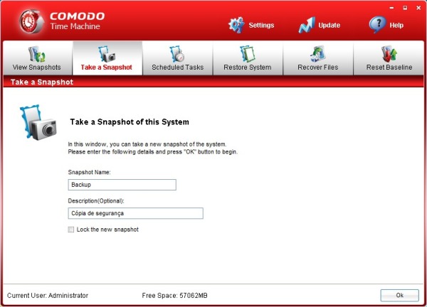 Finalmente, selecione suas preferências para o uso do programa dentro de "Settings". Além de personalizar a frequência para as fotos automáticas do sistema e outras preferências, o usuário define restrições de uso para o programa, prevenindo assim que usuários leigos façam alterações indevidas.Embora o programa seja bastante seguro, vale lembrar que o programa não deve ser utilizado sem o devido cuidado. Usar o Comodo Time Machine garante o funcionamento adequado do seu computador. Ao invés de gastar com um técnico ou formatar o PC, voltar ao passado pode solucionar seus problemas futuros. Vale lembrar que o software não é capaz de voltar a nenhum instante antes da sua instalação, portanto, não espere para adicionar sua proteção.