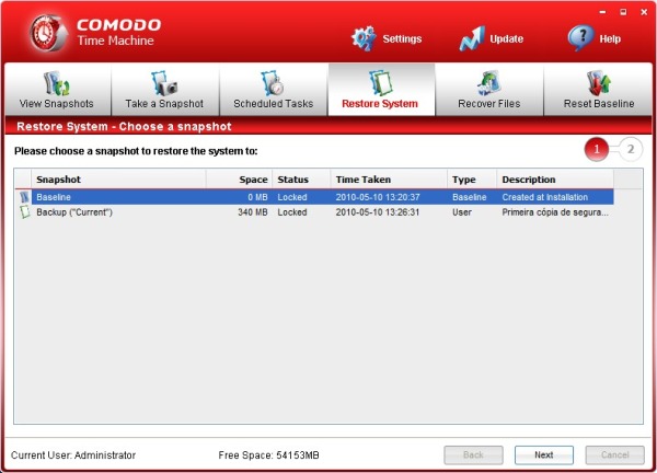 Comodo Time Machine é tão eficiente que nem é preciso aguardar até um momento crítico para aplicar sua recuperação. O software reinstala programas que foram deletados por acidentes, reverte processos que comprometem a máquina e reestrutura até a sua Área de trabalho.Para fazê-lo, dirija-se a aba “Restore System” (Restaurar sistema), escolha o momento em que deseja resgatar e clique em “Next”.