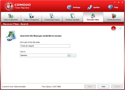 Não é preciso voltar no tempo só para buscar um único arquivo que deixamos para trás. Embora menos intuitiva, o programa oferece também uma ferramenta para a recuperação de documentos específicos dentro de fotos antigas do sistema na aba "Recover Files" (Recuperar arquivos).No primeiro passo, digite o nome do arquivo que deseja buscar (ou parte dele) e escolha dentro de qual snapshot ele se encontra. É claro que o tempo de busca é muito maior que uma simples varredura em seu disco local.